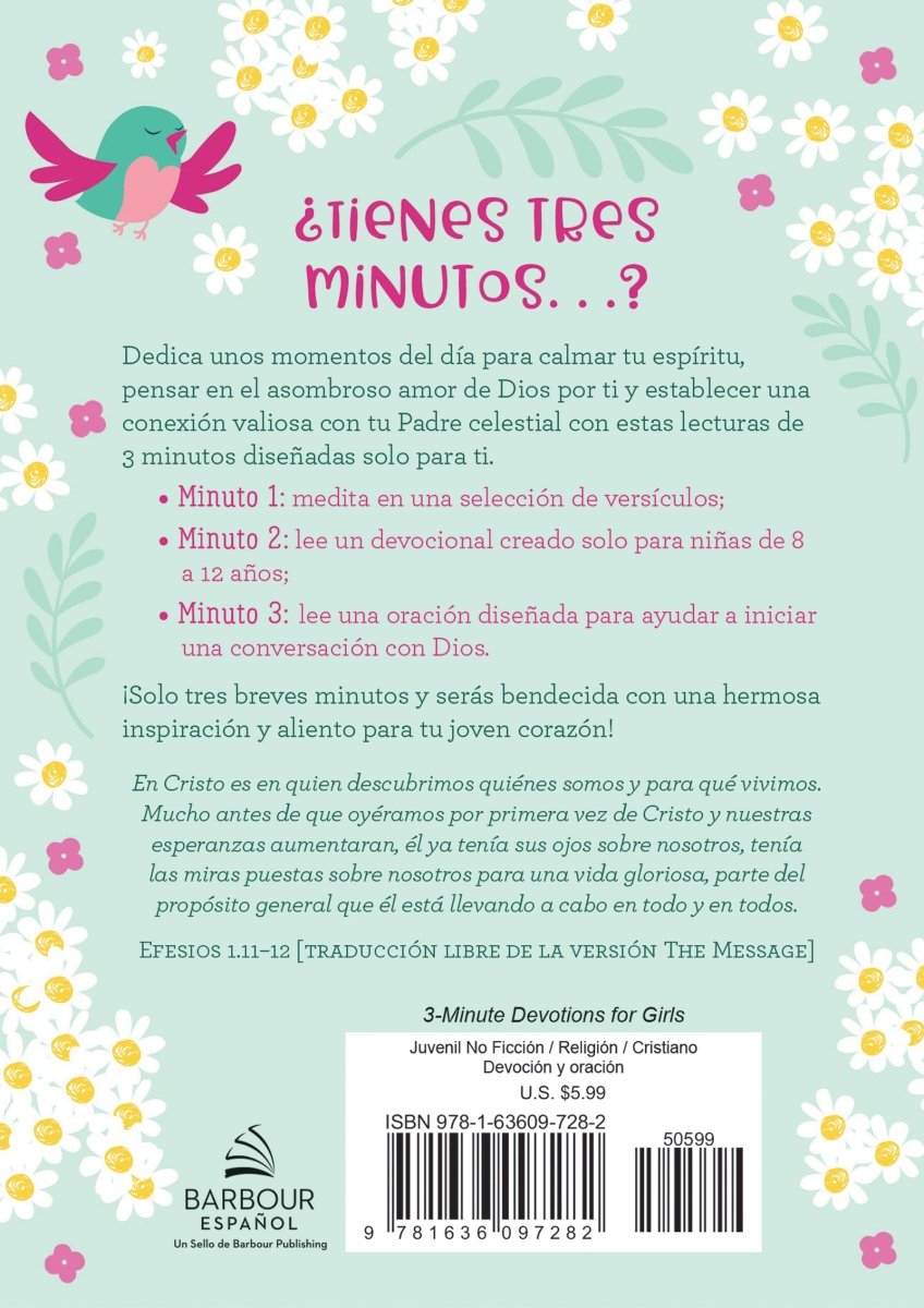 Dedica unos momentos del día para calmar tu espíritu, pensar en el asombroso amor de Dios por ti y establecer una conexión valiosa con tu Padre celestial con estas lecturas de 3 minutos diseñadas solo para ti. Este encantador devocional contiene una poderosa dosis de consuelo, ánimo e inspiración en lecturas con la extensión adecuada para tu joven corazón.