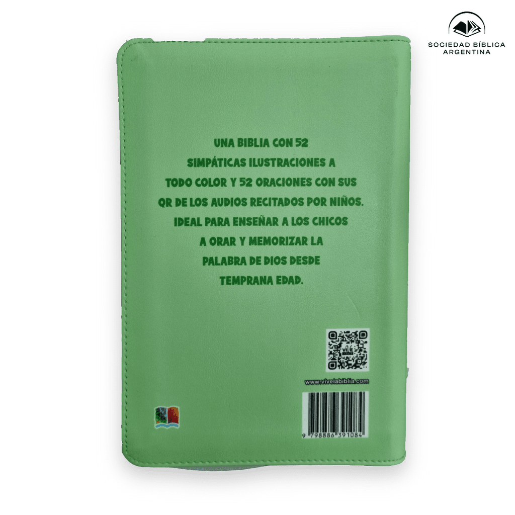 Una biblia con 52 simpáticas ilustraciones a todo color y 52 oraciones con sus QR de los audios recitados por niños. Ideal para enseñar a los chicos a orar y memorizar la palabra de Dios desde temprana edad.
